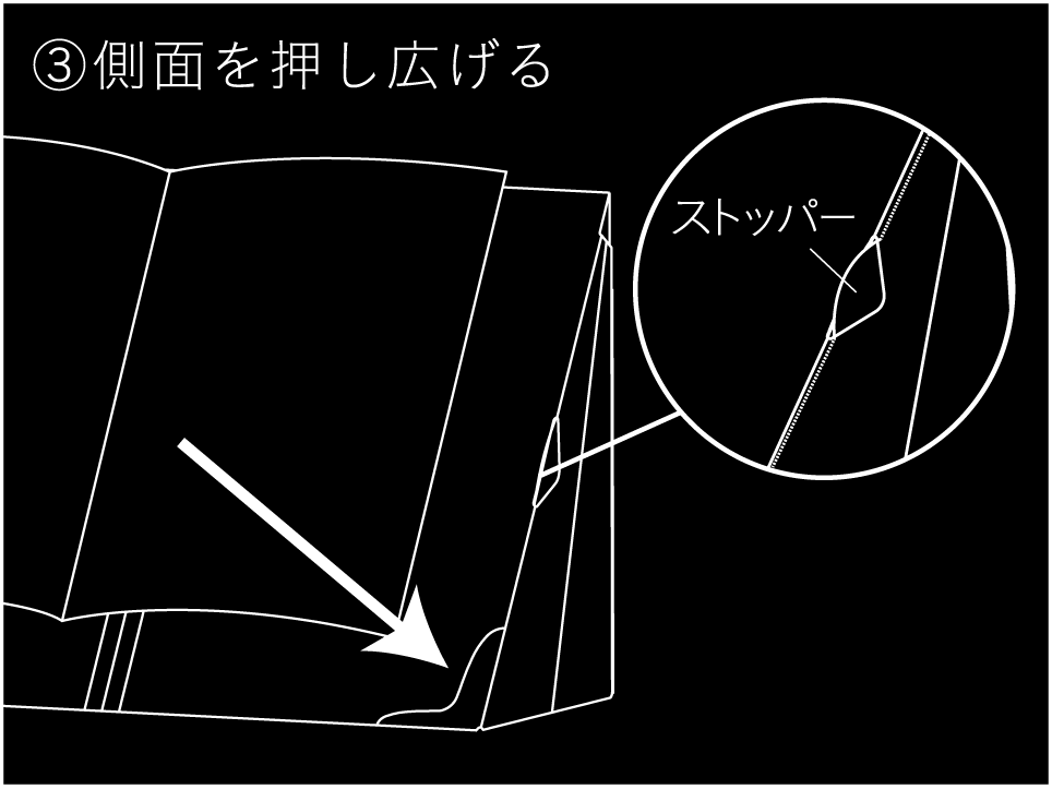 組み立て後、底面から内部へ手を入れ、側面のストッパーを穴に押し込んで試用してください。